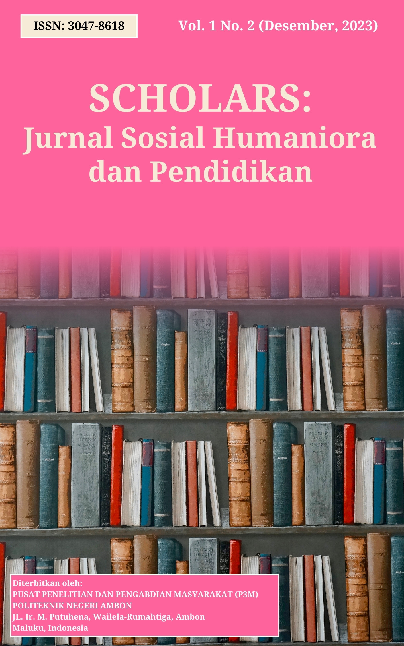 SCHOLARS: Jurnal Sosial Humaniora dan Pendidikan is a publication forum in the field of education and social humanities published by Ambon State Polytechnic in the form of research results, theoretical studies, methods and scientific ideas that are in accordance with the field of science (social humanities and education). SCHOLARS: Jurnal Sosial Humaniora dan Pendidikan is open to scientific articles from various circles, both national and international academics and practitioners and is a peer-reviewed journal that publishes quality scientific articles in Indonesian or English in the form of research results (top priority) and/or studies scientific.