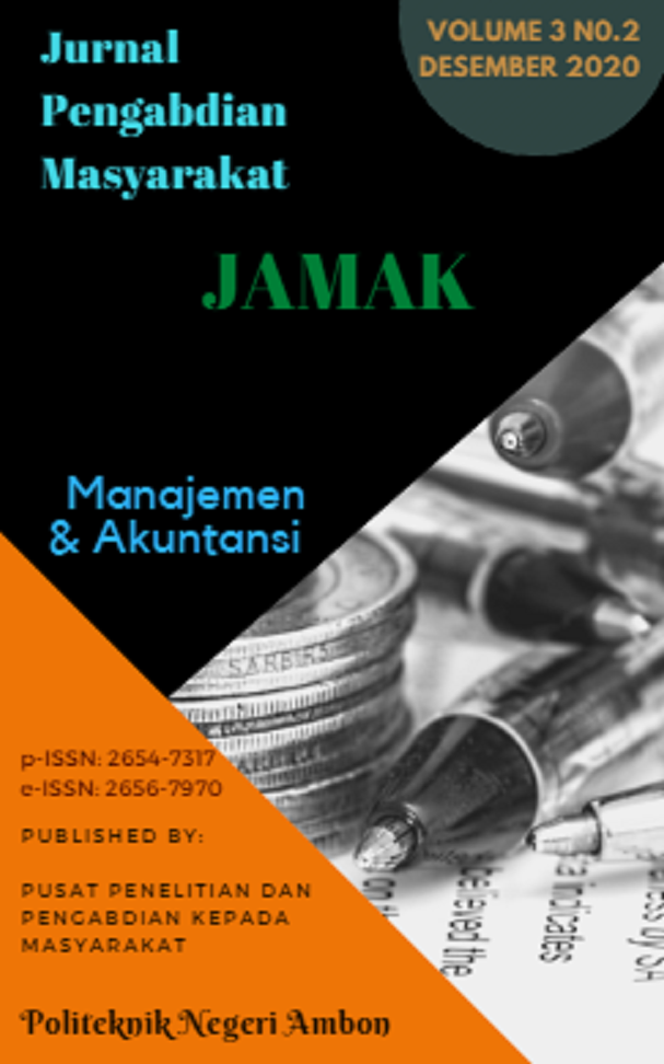 Jurnal Pengabdian Masyarakat JAMAK merupakan jurnal pengabdian masyarakat (ABDIMAS) di bidang manajemen dan akuntansi yang memuat artikel-artikel hasil kegiatan pengabdian masyarakat. SK no. 0005.26547317/JI.3.1/ SK.ISSN/2018. 11 - 5 November 2018 (mulai edisi Vol. 1, No.1, Desember 2018)